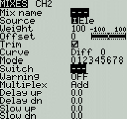* **Source** - The source for the mix. In addition to inputs, you can select sticks, pots, sliders, trims, physical and logical switches, heli mixer outputs, trainer import channel values, and other channels.