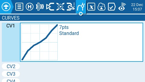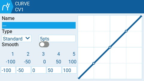 The **Curves** screen of Model Settings allows you to define custom curves to use in the Inputs, Mixes, or Output screens. The curves screen will show all of the configured custom curves, with a graphical representation of each curve, the number of points, and the curve type. &#x20;