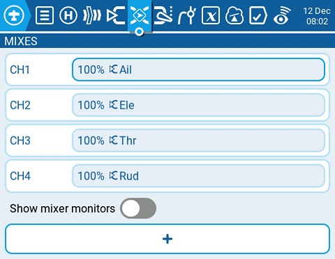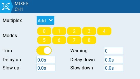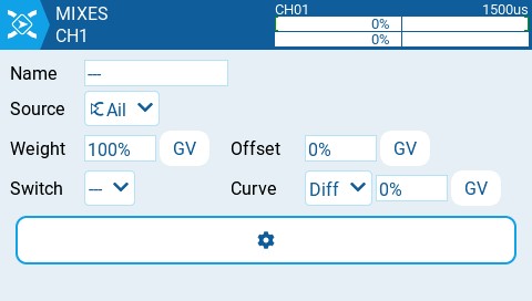 The Mixes screen of Model Settings is where several Inputs can be combined into one "Channel Mix". These mixes are then assigned to a radio channel for output. This is also the place where switches, knobs or sliders are assigned to a channel for output. Similar to the Input section, it is also possible to assign a weight, offset or curve to a channel mix.