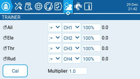 The **Trainer** screen in Radio Settings is used to configure how the radio in Master mode will handle the signals from the radio in Slave mode.