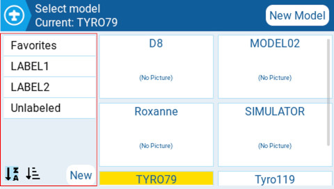 The icons below the label list are for sorting the filtered models. Models can be sorted either alphabetically or by the last time they were selected as described in the image below.