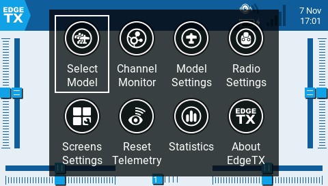 Touch the EdgeTX icon in the upper left corner of the screen to open the main navigation menu. Touch the desired menu option to select it.